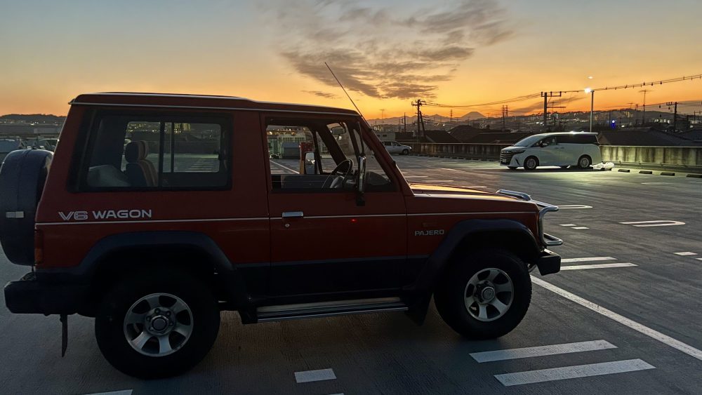 街と空の境界線。SUVのシルエットが際立つこの場所は、