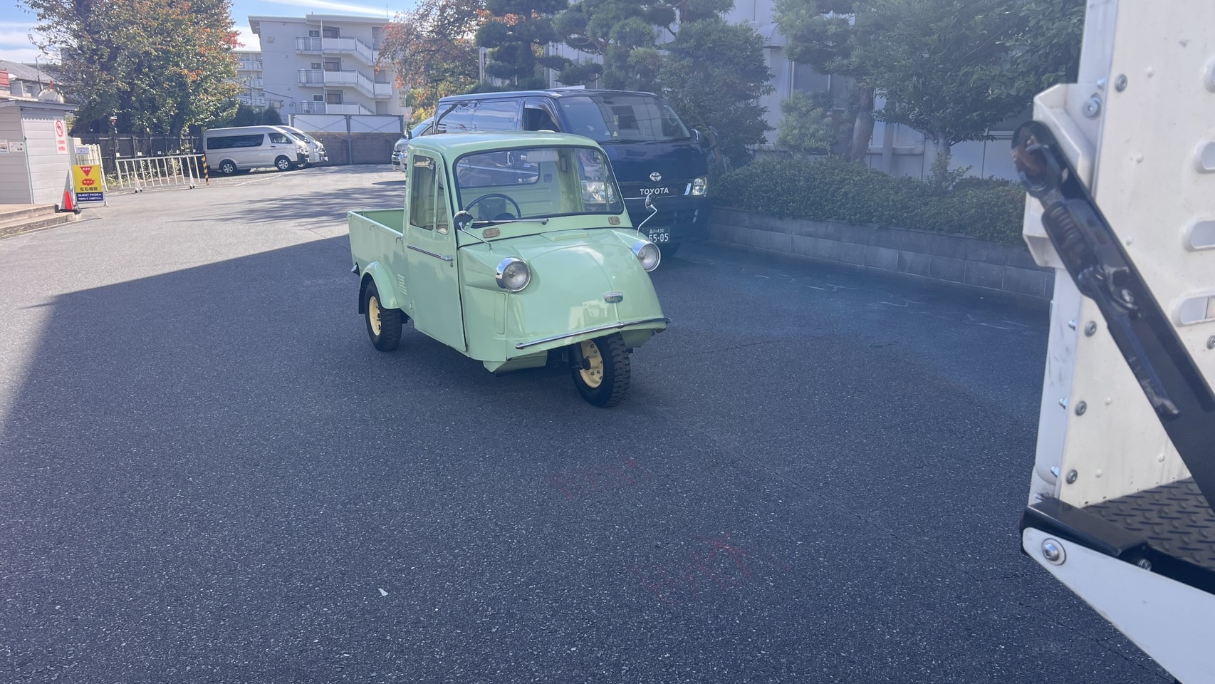 トラックの荷台に乗せられたミゼットは、これから新しい作品の一部になる喜びに満ちています。